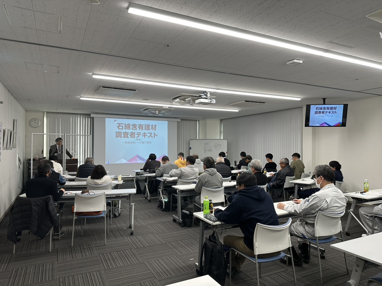 多くの受講者の皆様にご参加いただき、石綿含有建材調査者テキストを用いた講義を実施いたしました。